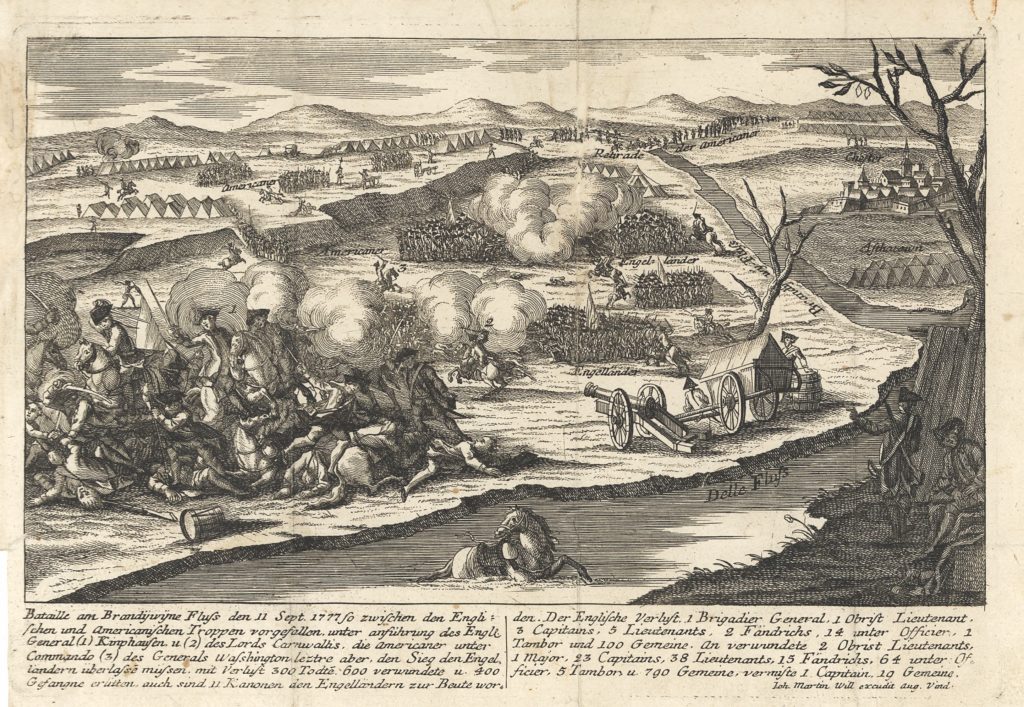 Le forze britanniche, rinforzate dai reparti mercenari degli assiani, sbarcarono la prima settimana di settembre del 1777. L'11 dello stesso mese l'Esercito continentale cercò di bloccarne l'avanzata presso il fiume Brandywine, nei pressi dell'odierna cittadina di Chadds Ford. L'attacco inglese per rompere il blocco fu portato su due colonne comandate dai generali von Knyphausen e Cornwallis; gli assiani al comando del generale tedesco si lanciarono contro il centro dello schieramento statunitense cercando di spezzarlo mentre quelle del britannico le circondavano utilizzando per la prima volta i fucili "Ferguson" a retrocarica, migliori di quelli statunitensi. Washington e il generale Greene riuscirono a rompere l'accerchiamento mentre una piccola retroguardia comandata da La Fayette, promosso quel giorno generale a soli vent'anni, si occupò di coprire la ritirata. Le perdite statunitensi erano, tra morti e feriti, di circa 700 uomini contro i 500 inglesi, quasi tutti feriti.